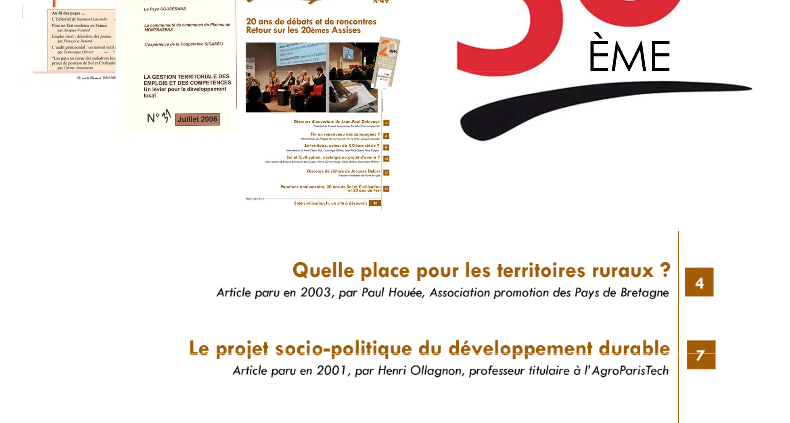 depuis ; ce sont plus de 150 auteurs qui ont ainsi participé à ces débats livrant leurs réflexions, analyses et témoignages. Qu’ils en soient tous remerciés. Dans cette période de débat démocratique où chacun cherche à proposer un chemin pour l’avenir de notre pays, nous avons souhaité saisir l’occasion d’un numéro spécial pour réaffirmer nos fondamentaux et remettre en perspective quelques textes qui ont marqué nos colonnes. Nous reviendrons ainsi dans les pages qui suivent sur des thématiques qui nous semblent importantes : la place du rural et de l’agriculture dans nos sociétés, le développement économique et la vie démocratique dans nos territoires. Nous espérons, ce faisant, éclairer des débats essentiels pour demain comme la nature du développement, l’organisation de nos territoires, la subsidiarité dans les niveaux de responsabilité. Ces thèmes me semble-t-il répondent en effet à trois grands enjeux que je voudrais, en guise d’introduction, souligner.